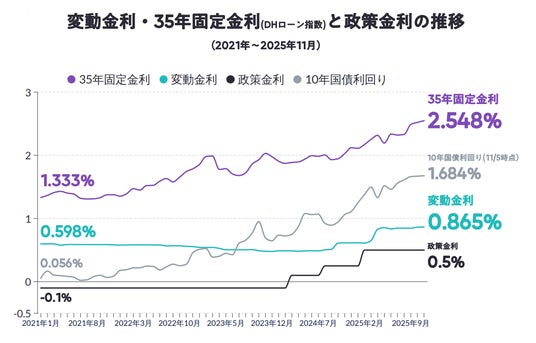 (出典)変動金利・35年固定金利(DHローン指数):ダイヤモンド不動産研究所「住宅ローンの金利推移(変動・固定)は? 最新の動向や金利タイプの選び方も解説【2025年】」2025.11.5時点、10年国債利回り:財務省「国債金利情報」2025.11.5時点