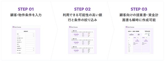 100以上の各銀行の住宅ローン商品の最新情報やTERASS独自の情報をワンストップで検索し、お客さまの条件に合わせたベストな住宅ローンを抽出・提案可能なシステムです。