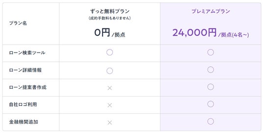 基本的なローン検索・詳細情報確認は完全無料でご利用いただけます。お客さま向けローン提案書の自動作成やカスタマイズ(自社提携銀行の情報組み入れなど)は有料オプションとなります。