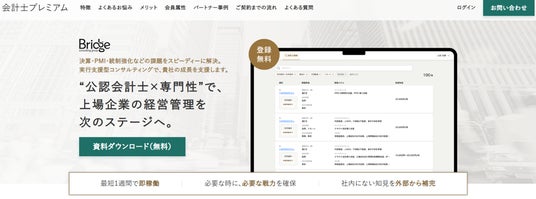 ブリッジコンサルティンググループ株式会社(本社:東京都港区、代表取締役CEO:宮崎良一、東証グロース:証券コード9225、以下「当社」)は、公認会計士に特化したマッチングプラットフォーム「会計士プレミアム」が2024年11月のサービス開始から1周年を迎えることをお知らせいたします。これを機に、利用企業にとって利便性・マッチング精度をさらに高めるため、システムアップデートを実施します。