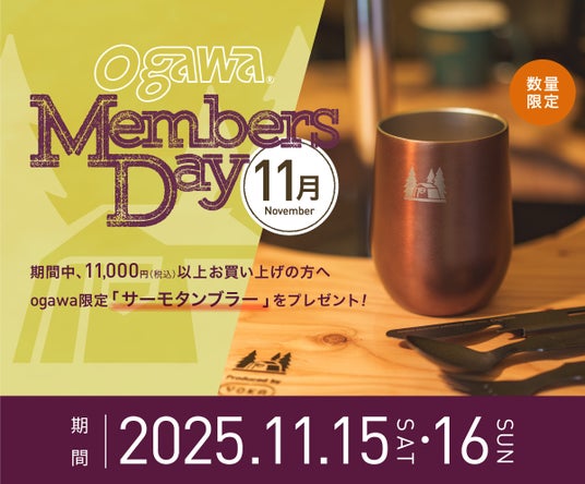 直営店 ogawa GRAND lodge、公式オンラインストア、直営キャンプ場 ogawa GRAND lodge FIELDにて、毎月第3土曜・日曜日に『ogawa MEMBERS DAY(オガワメンバーズデー)』を開催しています。毎月、ノベルティやポイントアップなど様々な特典やサービスをご用意しております。