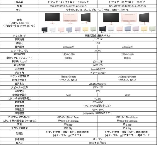 アイリスオーヤマ株式会社(本社:宮城県仙台市、代表取締役社長:大山 晃弘)は、当社初となるゲーミングモニターシリーズ「LUCA ゲーミングモニター」の23.8インチと27インチを2025年11月10 日より、インターネット通販サイトを中心に順次発売いたします(※1)。