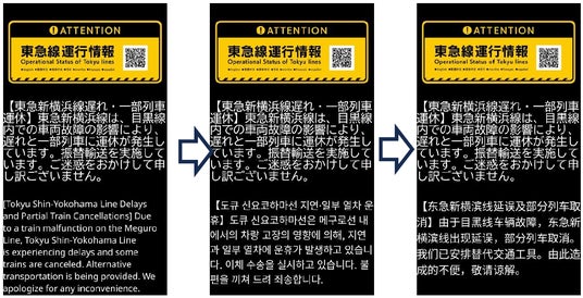日本語で提供されている「東急線運行情報メール」の内容を「Cotopat(R) Mobile」端末で受信し、端末内で日本語に加え任意の外国語に翻訳・文字化し、駅サイネージに表示します。