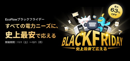 ポータブル電源とクリーンエネルギー技術のリーディングカンパニーである EcoFlow Technology Japan株式会社(本社:東京都中央区、以下EcoFlow)は、Amazonブラックフライデーに合わせて、2025年11月6日(木)より、EcoFlow公式ストアおよびEcoFlow Amazonストアにて最大63%OFF の特別セールキャンペーンを実施します。