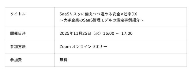 アイディルートコンサルティング株式会社(本社:東京都千代田区、代表取締役社⾧:石川 耕、以下:IDR) は、株式会社アシュアード(本社:東京都渋谷区、代表取締役社長:大森 厚志、以下:アシュアード社)と共催で、「SaaSリスクに備えつつ進める安全×効率DX ~大手企業のSaaS管理モデルの策定事例紹介~」を、2025年11月25日(火)にオンラインにて開催することをお知らせいたします。