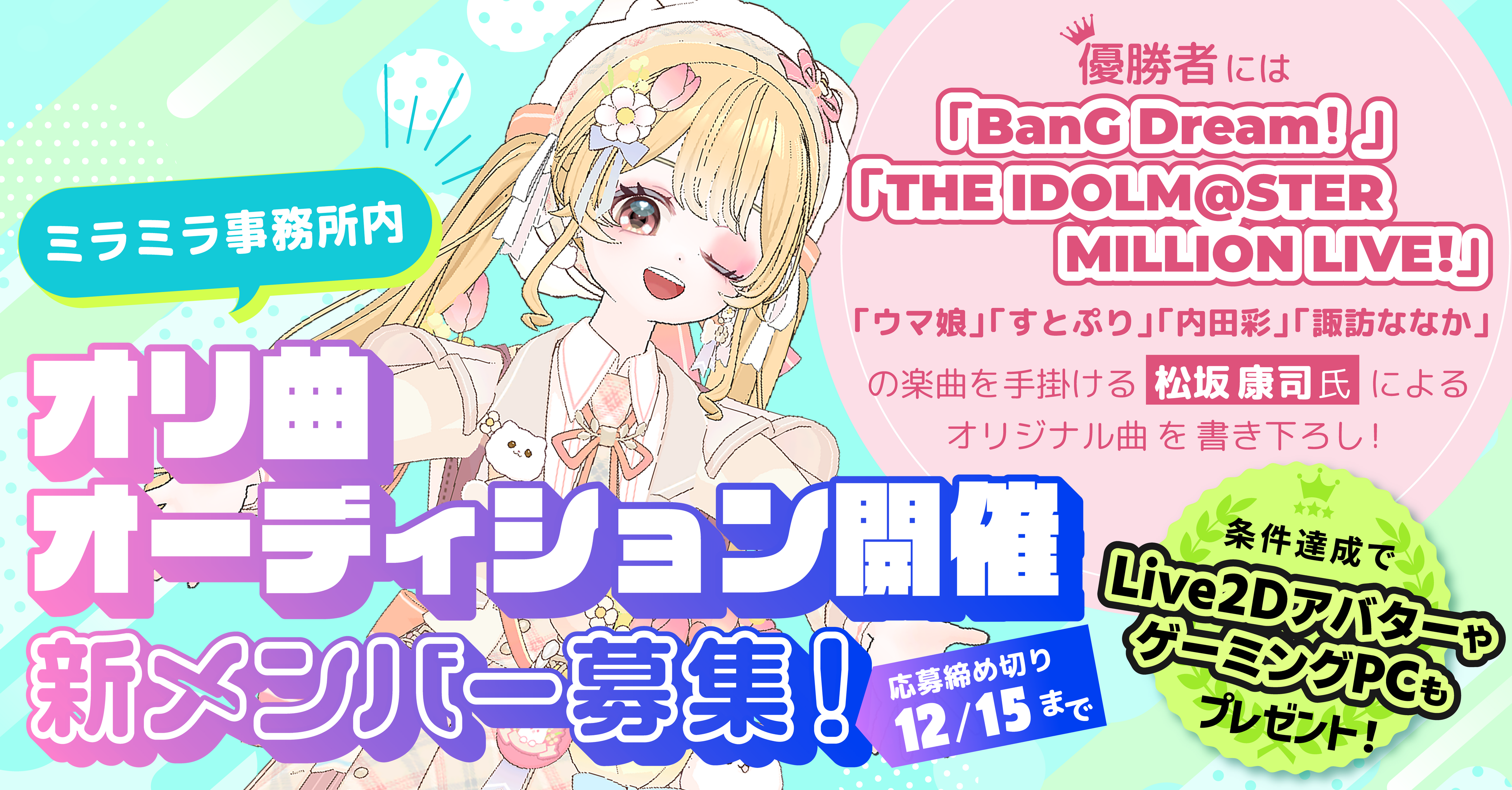 OTAGROUP株式会社(代表取締役:下西 竜二)は、スマホ画面共有型ゲーム配信プラットフォーム「Mirrativ」パートナー事務所「ミラミラ」の所属ライバー限定で2026年2月にオリジナル曲獲得オーディションを開催することをお知らせいたします。
