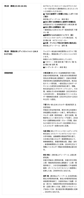 本セミナーでは、当社コンサルタントのほか、本プロジェクトに参加いただいている大場紀章様(ポスト石油戦略研究所)、下郡けい様(日本エネルギー経済研究所)に加えてゲストスピーカーとして毛涯郷史様(パナソニックホールディングス)をお招きし、GXが産業界に与える影響について最新動向をふまえて解説・議論いたします。