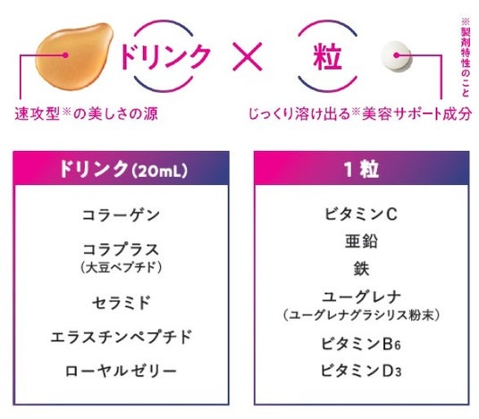 速攻型※2の美しさの源となる成分を“ドリンク”に、じっくり溶け出る※2美容サポート成分を“粒”に含有し、組み合わせることで、成分ごとに溶ける時間をコントロールしました。