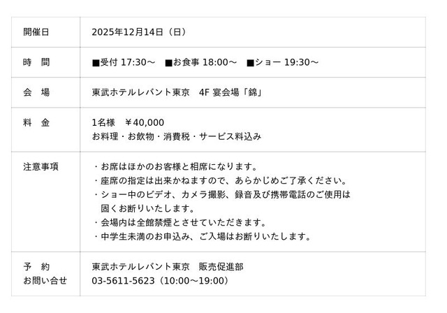 株式会社東武ホテルマネジメント(本社:東京都墨田区、代表取締役社長:三輪 裕章)の東武ホテルレバント東京(所在地:東京都墨田区)では、12月14日(日)に『小林幸子 クリスマスディナーショー』を開催いたします。2024年に芸能生活60周年を迎え、常に新たな挑戦をし続ける小林幸子氏の圧巻のパフォーマンスと、東武ホテルレバント東京が贈るこだわりのコース料理とともに、一夜限りの特別な体験をお届けいたします。