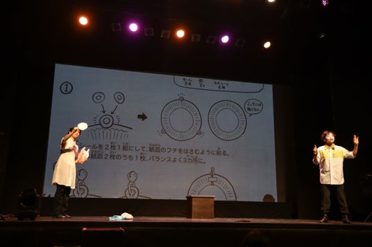 各回開演30分前より、上演中に出演者と一緒に演奏できるオリジナル楽器をつくる「楽器作りワークショップ」が行われました。作成する楽器は家庭で揃えられるような材料で簡単に作れる打楽器で、鳴らすタイミングは舞台奥のスクリーンに表示されるので、子どもや観劇に慣れていない人でも参加しやすい上演となりました。