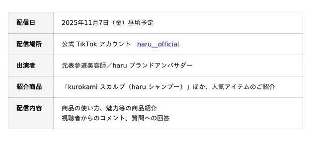株式会社nijito(本社:東京都港区、EC事業部:福岡市中央区)が展開するヘッドビューティブランド「haru」は、2025年11月7日(金)に公式TikTok Shopを開設いたします。当日は、元表参道美容師のブランドアンバサダーが出演するライブ配信を実施し、「kurokamiスカルプ(haruシャンプー)」を中心に、商品の魅力や使い心地をリアルタイムでご紹介いたします。ライブ視聴から購入までがシームレスにつながる“新しい購買体験”を通じ、ブランドが提案する“ヘッドビューティ”(*1)を動画やライブの中でリアルに感じていただける、新たな体験の場として展開してまいります。