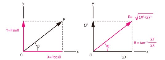 このとき、図4の左に示すように、x軸と角度θを成す平面力Pのx方向の分力はPcosθ、y方向の分力はPsinθで表すことができます。