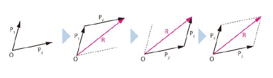 合力Rは、その次の図に示すように、P2の終点にP1の始点を移動させても同様に求めることができます。従って、図2の右に示すように、平行四辺形を描くことで合力Rは求められます。