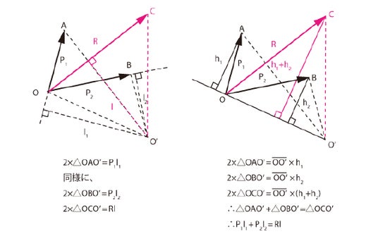 ここで、図2の左から2番目に示すように、P2の作用点(始点)をP1の矢印の先(終点)に移動します。また、P1の始点とP2の終点とを結ぶ直線を描いて、P2の終点側に矢印を描きます。