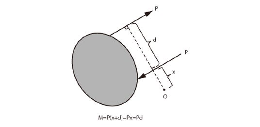 偶力とは、物体に2つの平面力が作用するとき、これら2つの力の大きさが等しく、かつ方向が反対向きで、その作用線が平行な1組の力をいいます。