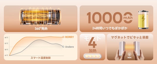 RORRYの充電式カイロは合計10000mAh(1個あたり5000mAh)の大容量バッテリーを搭載し、約3時間の充電で満タンに。低温モードなら最長10時間以上の連続使用が可能です。