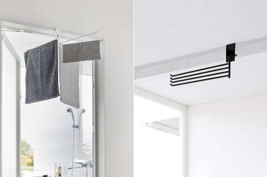 浴室のドア枠や鴨居、リビングなどの開口枠に取り付け可能な、室内用の物干しタオルハンガーです。