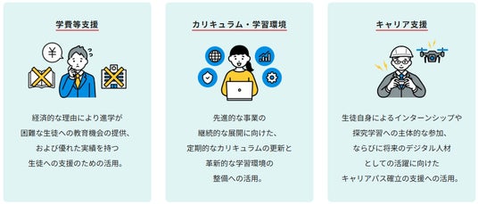 企業・団体のみなさまからのご支援は、以下の3つの柱に基づき、教育環境の充実と入学機会の拡充に活用いたします。