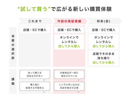 オンラインでレンタルを申し込み、自宅でお試し。納得すれば購入、購入に至らない場合は返却可能な「試して買う」体験を提供する実証実験。