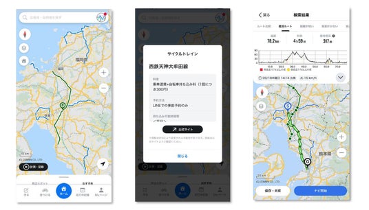 第一弾として、天神大牟田線(西鉄福岡(天神)駅~大牟田駅間)の「サイクルトレイン」の運行路線情報を、『自転車NAVITIME』アプリ内の地図上に表示します。運行路線上の電車アイコンをタップすることで、「サイクルトレイン」を利用可能な時間帯、料金、予約方法、車両への自転車持ち込み条件(乗車ルール)といった詳細情報を確認できます。
