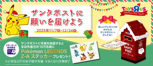 専用ハガキはポケモンデザイン、「サンタポスト」にお手紙を投函していただいたお子様、全店先着合計100,000名様にトイザらスオリジナルの「Pokemon LEGENDS Z-A ステッカー」をプレゼントいたします。