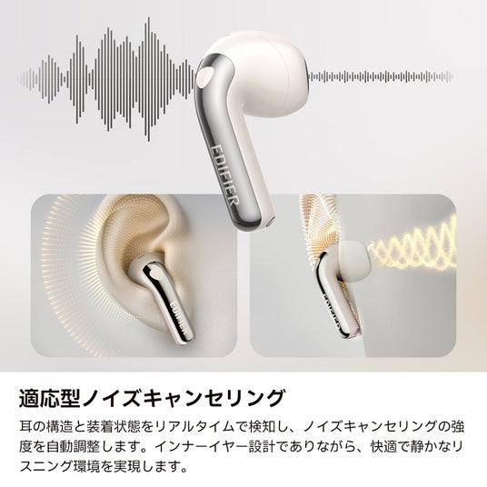 「EvoBuds」は耳の構造や装着状態をリアルタイムで検知し、周りの騒音環境に合わせてノイズキャンセリングの深度を自動調整します。リラックスしたフィット感を得られるセミインイヤー設計により、圧迫感を軽減しつつ高いノイズリダクション効果を実現。