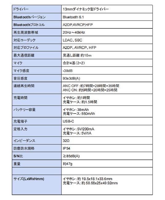 iOS/Android OSアプリ「Edifier ConneX」(無料、日本語対応)をご利用いただくと、ノイズキャ ンセリング設定や、イコライザーを用いた音質調整、サウンドモード、装着検出、タッチコントロー ル設定など「EvoBuds」が持つさまざまな機能を活用いただけます。■製品仕様