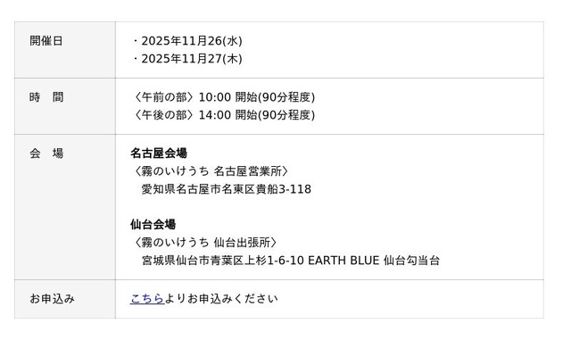 公式ページ及び、上記開催地からご都合の良い会場と日程を選んでお申し込みください。