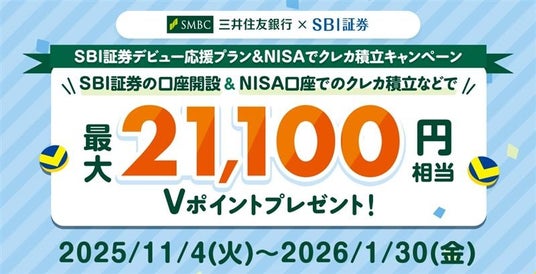 三井住友銀行経由でSBI証券の口座開設(※1)、NISA口座でのクレカ積立などで最大21,100円相当のVポイントがもらえます。