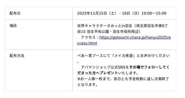 コラボ記念カードは、2025年11月15日(土)・16日(日)に開催される「世界キャラクターさみっとin羽生」のべあ~君ブースにて配布します(各日先着・なくなり次第終了)。