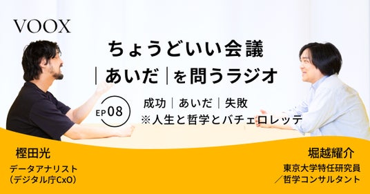 堀越耀介氏(東京大学特任研究員/哲学対話)と樫田光氏(デジタル庁/データ分析)。異なる専門性を持つ二人が世の中の様々な「白か黒か、どちらか一方に割り切れない物事」=“あいだ”について語り合います。何かと何かの“あいだ”を切り口に問いを進めることで予測不能な化学反応を生み出し、聴く人に新たな気づきを与えてくれる。そんな"ちょうどいい"を探求する二人のクロストークをお楽しみください。