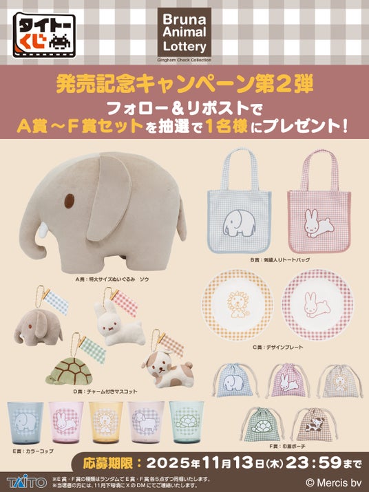 「タイトーくじ ブルーナアニマル Gingham Check Collection」の発売を記念して、「A賞~F賞セット」を抽選で1名様にプレゼントするキャンペーンを実施いたします。