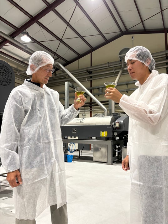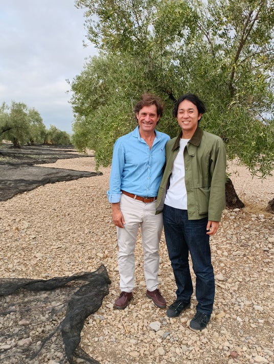 スペイン・ルケ家の搾油場でみずみずしい搾りたての香りを確認する搾油責任者・大坪(左)と、井上誠耕園四代目・井上健也(右)
