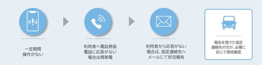 アプリが異常を検知(一定時間スマホの利用がないなど)した場合、ご本人へのプッシュ通知や事前登録先へのメール通知を行った上で、ご本人へ電話連絡し、安否確認を行います。電話不応答の場合も再連絡を実施します。