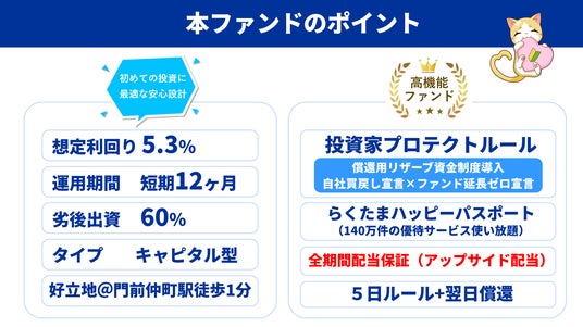 『らくたま』は、不動産クラウドファンディングをより安心で身近な資産形成の手段としてお届けするために誕生しました。私たちは安全性と透明性を常に重視し、堅実なファンド設計と多彩な特典プログラムを通じて、従来の「投資=堅い・難しい」という固定観念を取り払い、誰もが1万円から参加できる新しい投資体験を提供してまいります。信頼に支えられた資産運用を楽しみながら、以下の特典もぜひご体験ください。