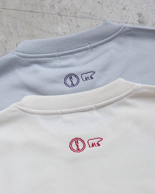 コラボレーションする老舗7店のロゴを背中にプリントした日本橋スウェット。シンプルかつ暖かみのあるアイボリー・ダルブルーの2カラーでご用意しました。