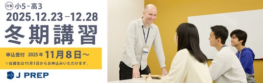 小学生・中学生・高校生を対象とする英語塾 J PREP を運営する株式会社 J Institute(本社:東京都渋谷区、代表取締役:斉藤淳)は、2025年11月8日(土)より、冬期講習の受講生募集を開始いたします。冬期講習は12月23日(火)に開講し、未入塾の方も受講可能な公開講座を、都内を中心とした6校にて実施いたします。より多くの生徒に学びの機会を提供するべく、幅広く受講生を募集いたします。