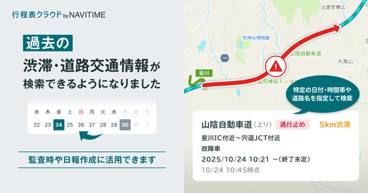 株式会社ナビタイムジャパン(代表取締役社長:大西 啓介、本社:東京都港区)は、2025年11月7日(金)より、貸切バス対応の行程表作成Webサービス『行程表クラウド by NAVITIME』にて、業界で初めて※1、過去の高速道路交通情報を検索・確認できるようになります。運行後に、運行当日の詳細な渋滞などの交通情報を確認し、出力もできるため、日報作成や監査時に活用できます。