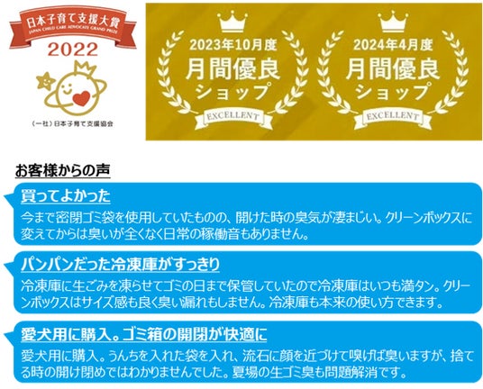 2022年には、乳幼児のいる家庭のオムツゴミの臭いを根本から解決する製品として「子育て支援大賞2022」(一社 子育て支援協会)企業部門受賞。さらに、楽天市場では、上位1%のショップしか選ばれない「月間優良ショップ」に、 2023年10月度、2024年4月度の2回受賞、という栄誉をいただきました。