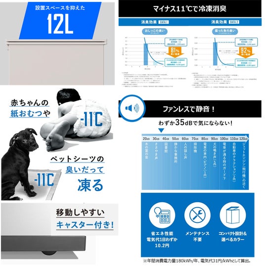産業機器製造で培った経験と技術力を活かし、家庭の電力でも強力にゴミを<マイナス11℃>という低温で冷凍することで、生ごみはもちろん、赤ちゃんのおむつ、ペットのトイレなど、常温では腐敗が進むことで起こる「ゴミの臭い」問題を解決する、というありそうでなかった機能性、スッキリ凹凸のないボディ、シンプルでスタイリッシュなデザイン、メンテナンスも消耗品の交換も必要ない操作性、省電力、静音性と、細部にまで配慮した設計で多くのご愛用者を獲得。各種賞もいただきました。