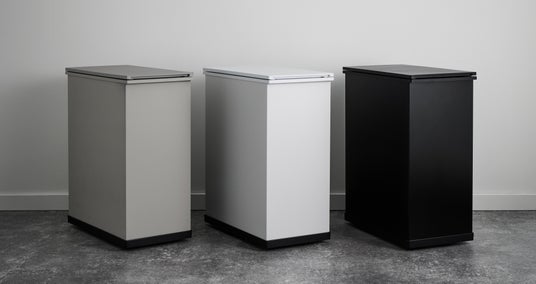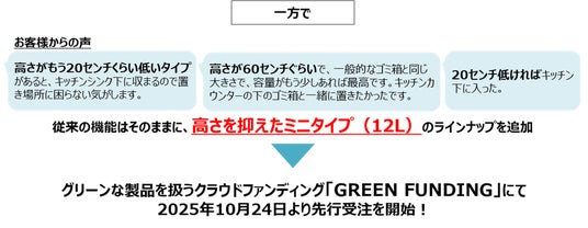 “キッチン家具の下などに収納しやすいサイズが欲しい”というお客様の声を受け、高さを抑えたミニタイプ12L容量を開発し、クラファンでの反響を受け、一般販売を実現!