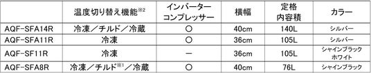 【「スリムフリーザー」シリーズ 各商品の主な機能・特長の違い】