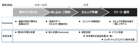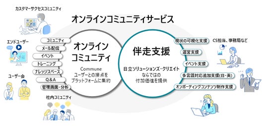本サービスでは、コミューン株式会社*1の「Commune」のコミュニティサクセスプラットフォームや分析サービスなどの関連サービスを採用し、プラットフォームの導入からコミュニティの運営までを日立ソリューションズ・クリエイトのコミュニティデザイナーが伴走します。これにより、お客さまの業務プロセスに合わせた的確な導入・分かりやすいコンテンツ作り・適切な運営をワンストップで支援し、カスタマーエクスペリエンス(CX)の向上を通じ、カスタマーサクセスの実現をめざします。