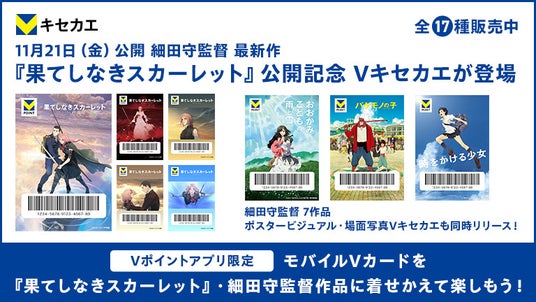 CCCMKホールディングス株式会社(本社:神奈川県横浜市、代表取締役社長兼CEO:高橋 誉則)は、Vポイントアプリの「モバイルVカード」を好きなデザインに着せかえできる「Vキセカエ」(https://ip.tsite.jp/guide)において、細田守監督最新作『果てしなきスカーレット』の公開を記念し、細田守監督がこれまで手掛けたアニメーション映画7作品のポスタービジュアルや、映画の名シーンを使用したデザイン全17種を、2025年11月7日(金)より期間限定で配布・販売いたします。