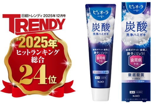 このたび、「2025年ヒット商品ベスト30」にて24位に選出された『ピュオーラ 炭酸ハミガキ』は、日本初*3 となる炭酸*1 発泡ハミガキペーストとして、2025年4月5日に誕生しました。ペーストが水分に触れると、重曹とクエン酸が反応してジュワっと発泡。微細な炭酸*1 泡が、汚れや菌が残りやすい歯周ポケット*4 や歯間まで*5 入り込み、お口のすみずみまで洗浄します。歯周ポケット*4 の磨き方に課題を抱えている生活者の本音と実態を捉え、開発された商品です。