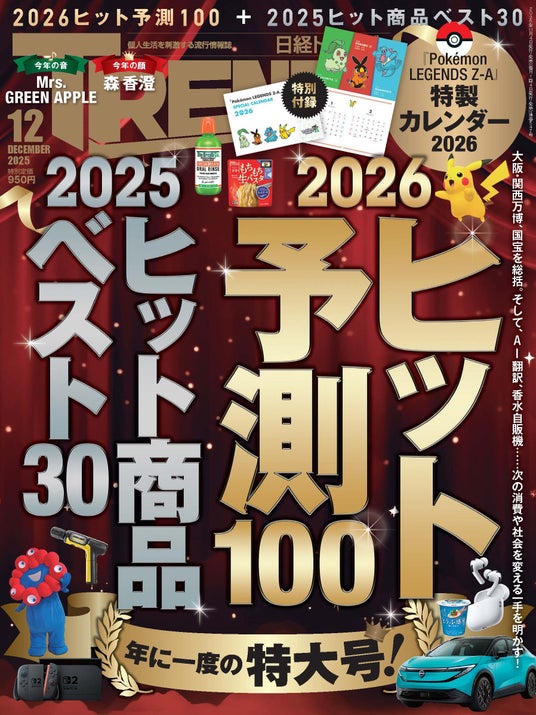 「日経トレンディ」の「2025年ヒット商品ベスト30」は、2024年10月から2025年9月の間に発表・発売された商品・サービスなどを対象に、「日経トレンディ」がヒットの度合いを評価。「売れ行き」「新規性」「影響力」という3項目に沿って総合的に判定されランキングが決定する毎年恒例の企画です。