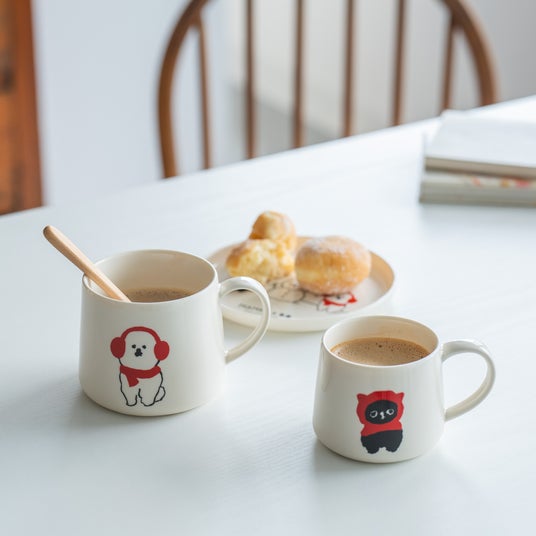 CLASKAのオリジナル商品「ドーのマグカップ スリム」と「ドーのマグカップ スリム mini」に、MAMBOとB.B.をプリント。左)「MAMBO マグ Slim / WINTER earmuffs」 サイズ:直径9.5(持ち手を含んだ幅12)×高さ7.5cm 容量:350ml 素材:磁器 右)「B.B. ミニマグ Slim / WINTER hood」 サイズ:直径8(持ち手を含んだ幅10.7)×高さ6.6cm 容量:200ml 素材:磁器