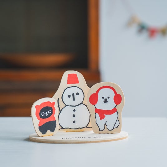 こちらは、雪だるまと一緒に遊ぶMAMBOとB.B.がプリントされたバージョン。 包装時:W11×H16cm 組立時:W15×D9.5×H10cm
