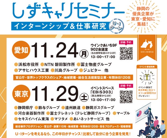 静岡県庁や楽器メーカーの河合楽器製作所など、静岡県に拠点を置く企業が、県外を飛び出しUIターン学生向けの合同イベント「しずキャリセミナー」に参加します。