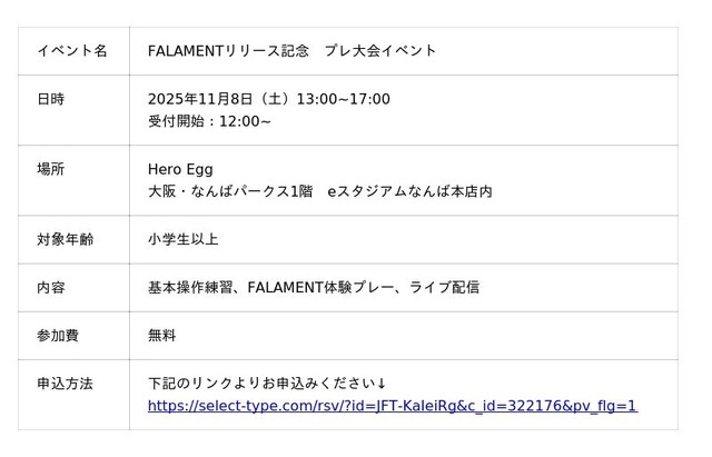 株式会社Meta Heroes(本社所在地:大阪府大阪市、代表取締役:松石和俊、以下「当社」)は、ソリッドソニック株式会社(兵庫県神戸市、代表取締役:久保貴弘)、株式会社ASTOLTIA(東京都渋谷区、代表取締役:若林祐衣)、株式会社オンテロープ(東京都新宿区、代表取締役:澤田真吾)と共同で開発したメタバースゲーム『FALAMENT』(ファラメント)のプレ大会イベントを、2025年11月8日(土)に当社のDX教育施設「Hero Egg」にて開催いたします。